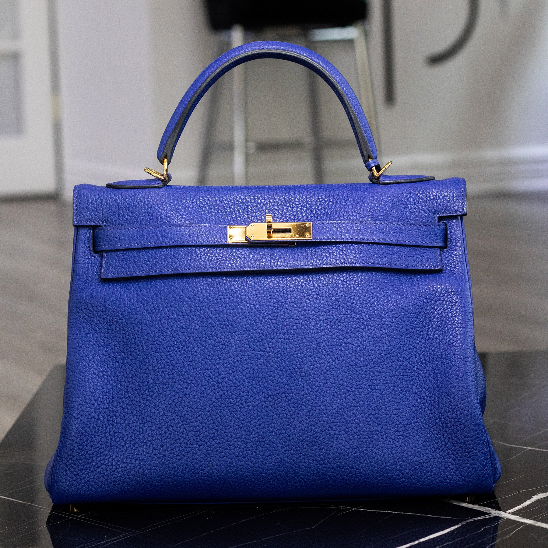 Title: Hermes Kelly 32 Electric Blue Leather Handbag